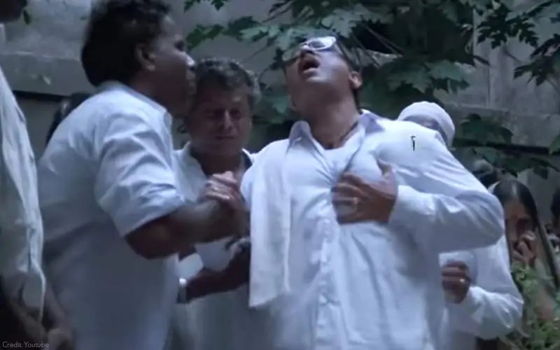 I was thinking about the irony of Kamal not crying out aloud in a funeral scene. What a flip that was especially when the scene where he cries during his son’s funeral in Nayakan became one of the biggest selling points and how the actor has been famous for his performances during death scenes. And here he is even made to shush the people who are grieving loudly.
